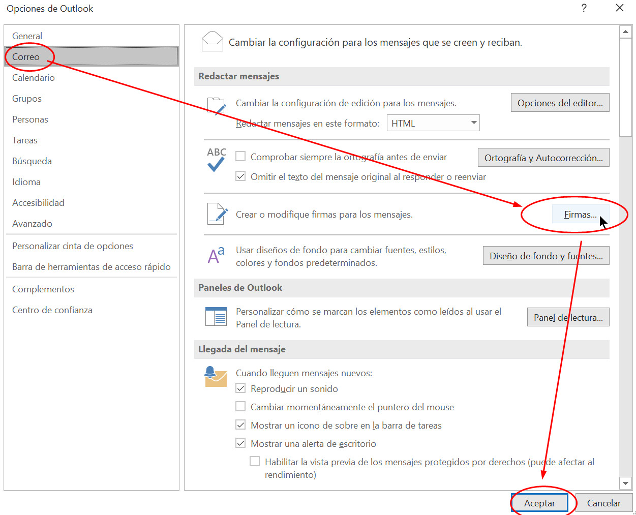 3. Luego ir al menú de las opciones y seleccionar CORREO y luego botón de Firmas